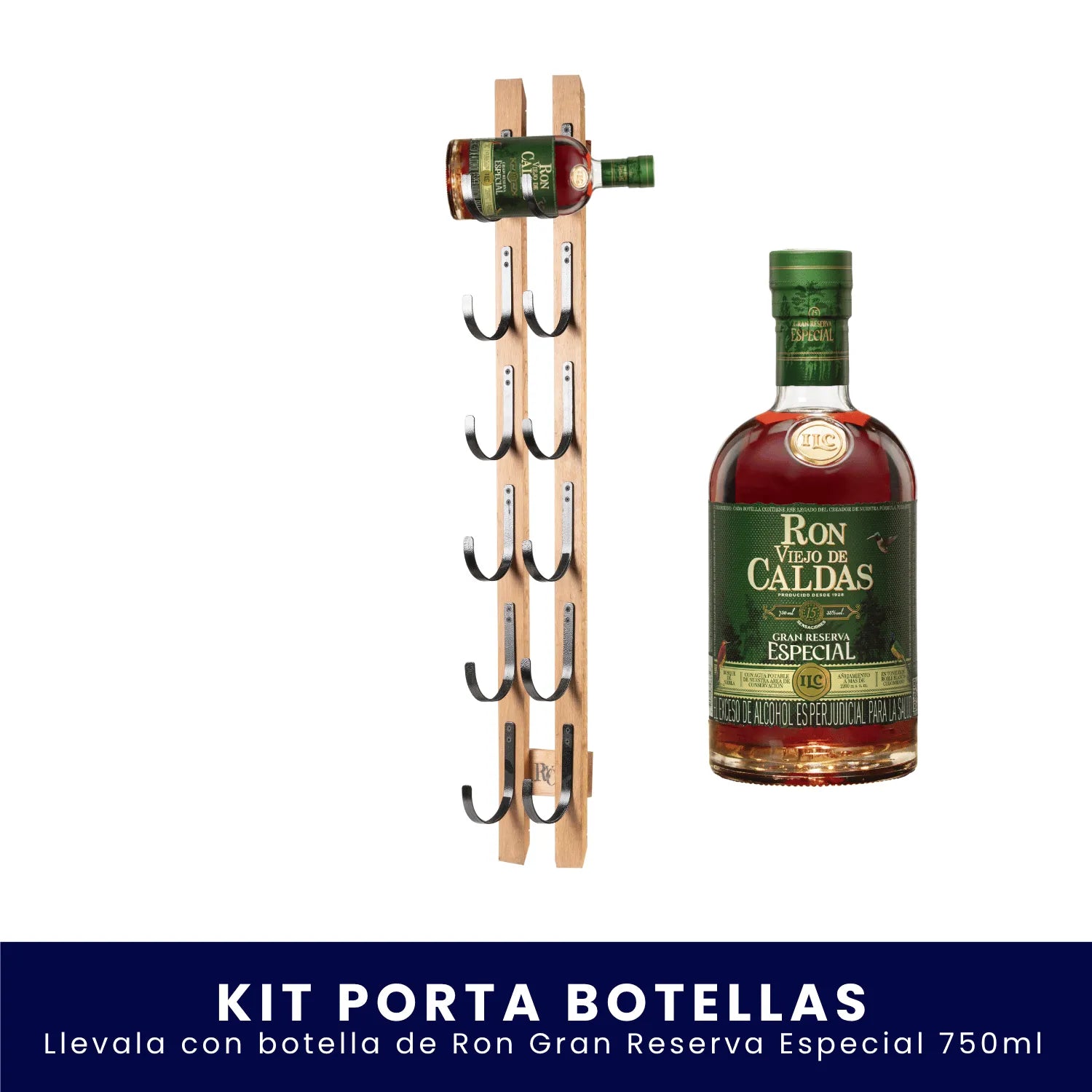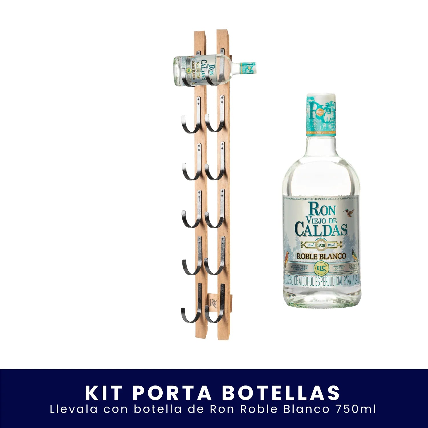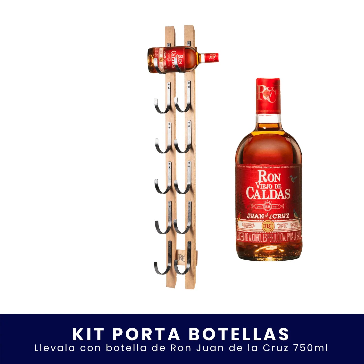 El Porta Botellas Ron Viejo de Caldas es la pieza ideal para exhibir con orgullo tu selección favorita. Fabricado en madera con acabados artesanales, tiene espacio para colocar hasta seis botellas y darle a tu espacio un toque auténtico y elegante.