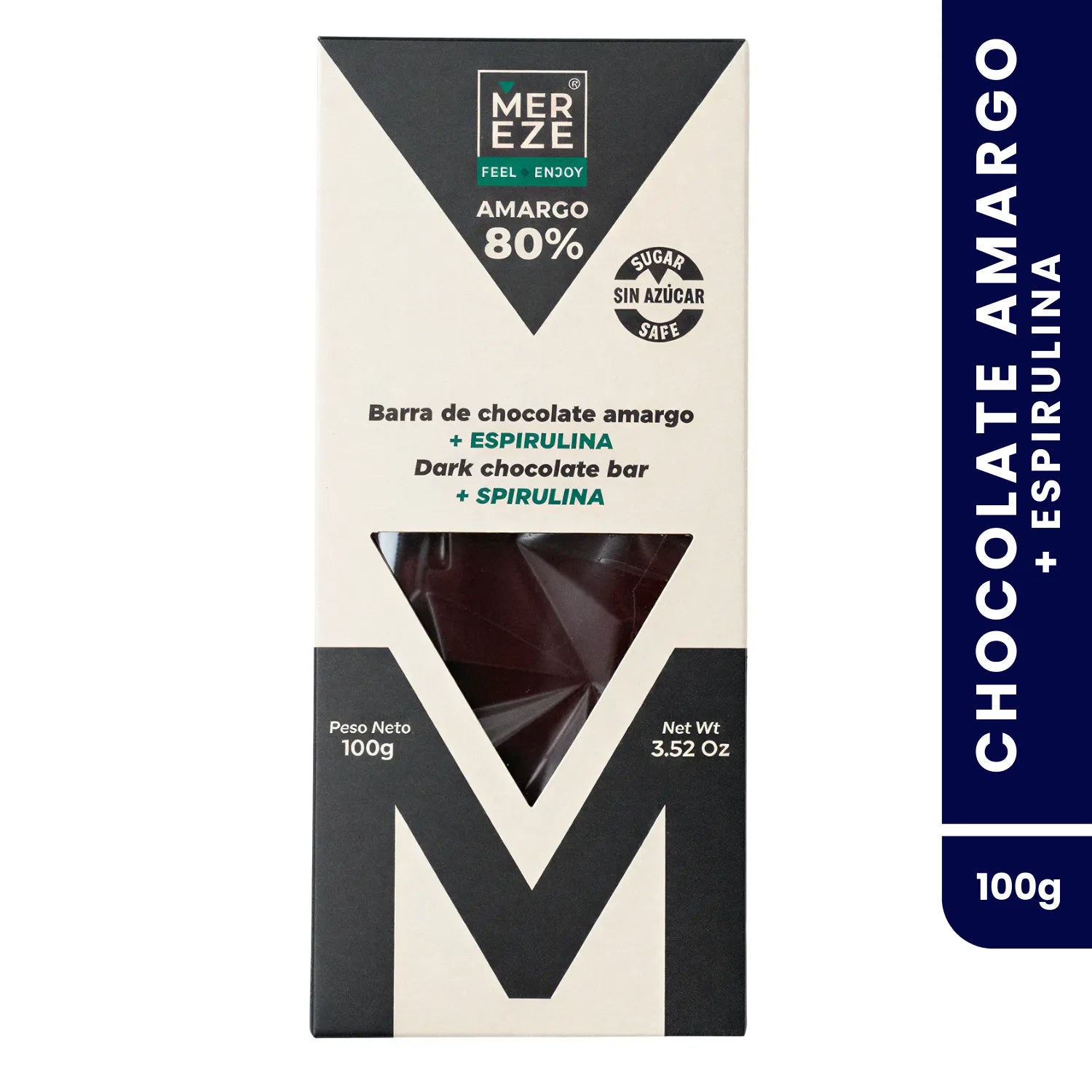 La Barra de Chocolate Amargo 80% + Espirulina de Mer Eze combina cacao premium sin azúcar añadida con espirulina natural, creando un chocolate profundo, elegante y con un toque funcional.