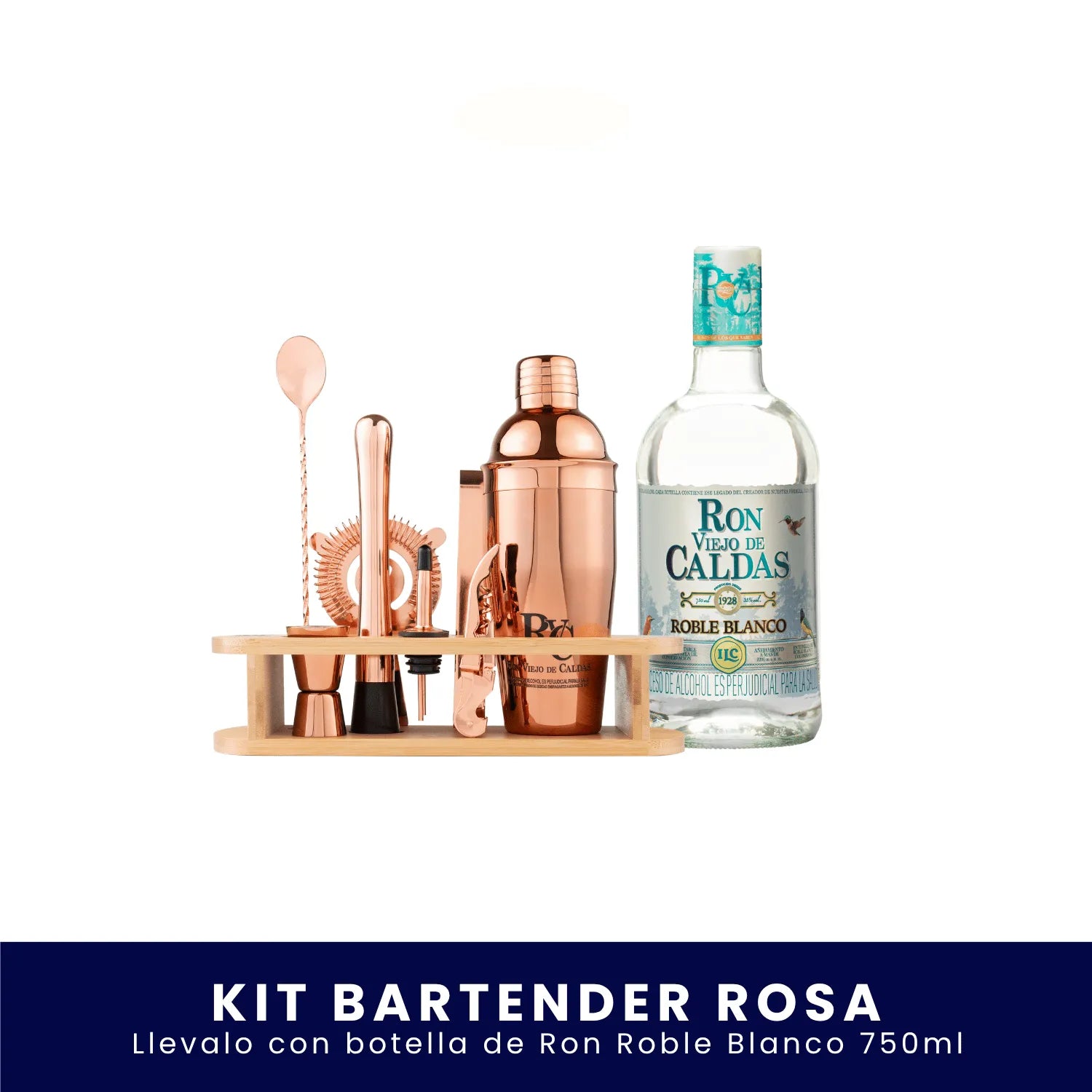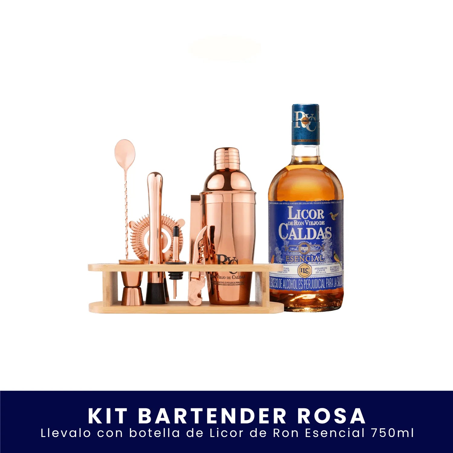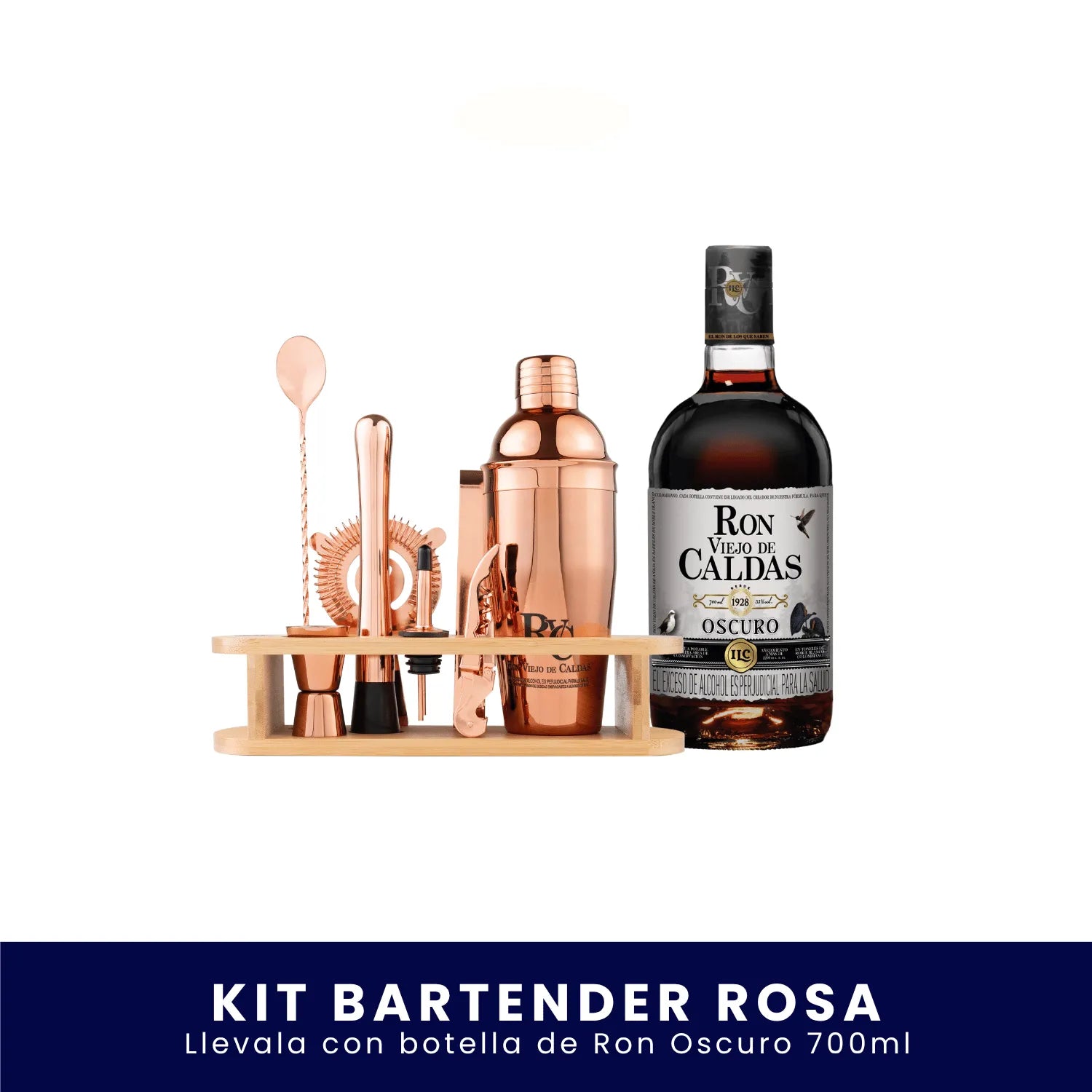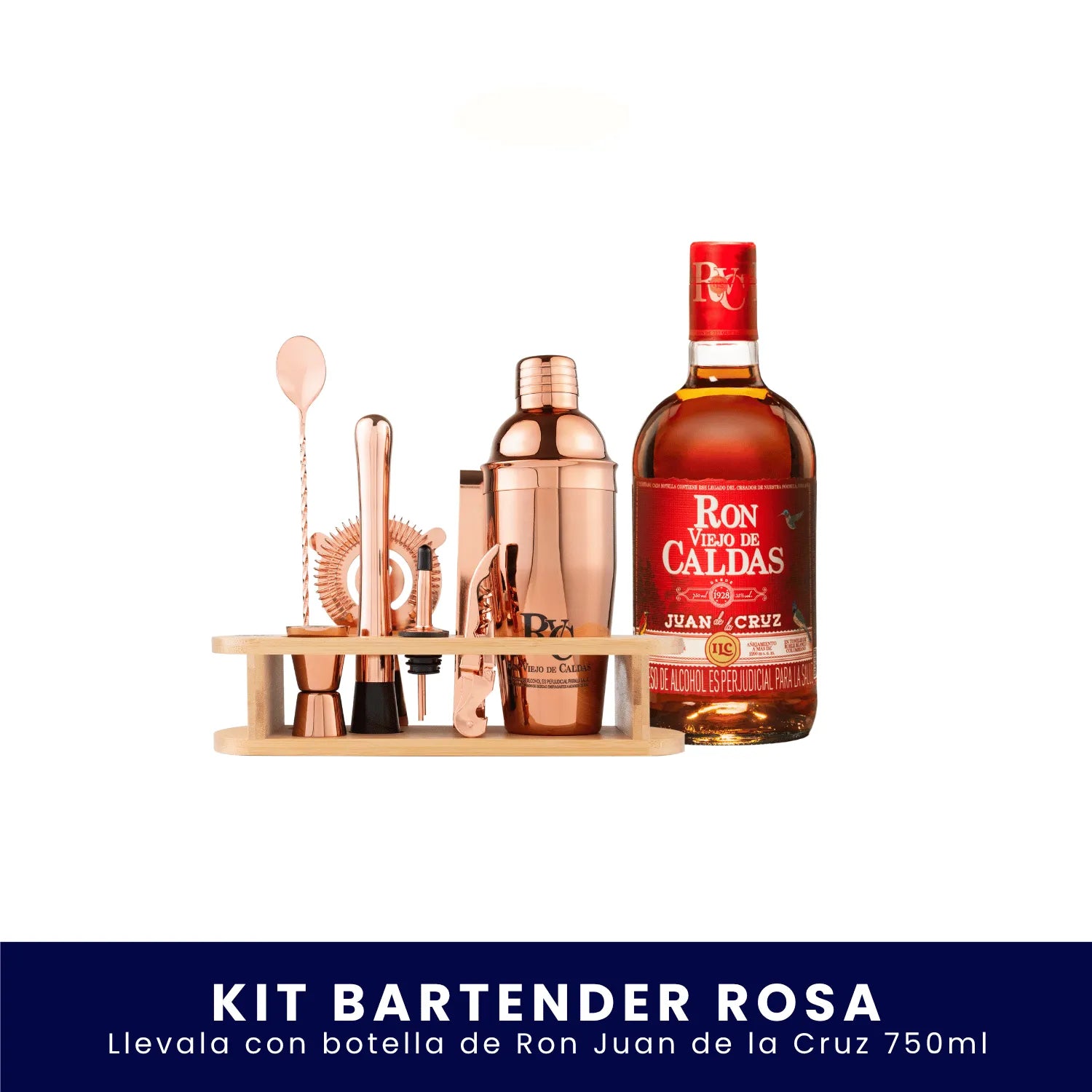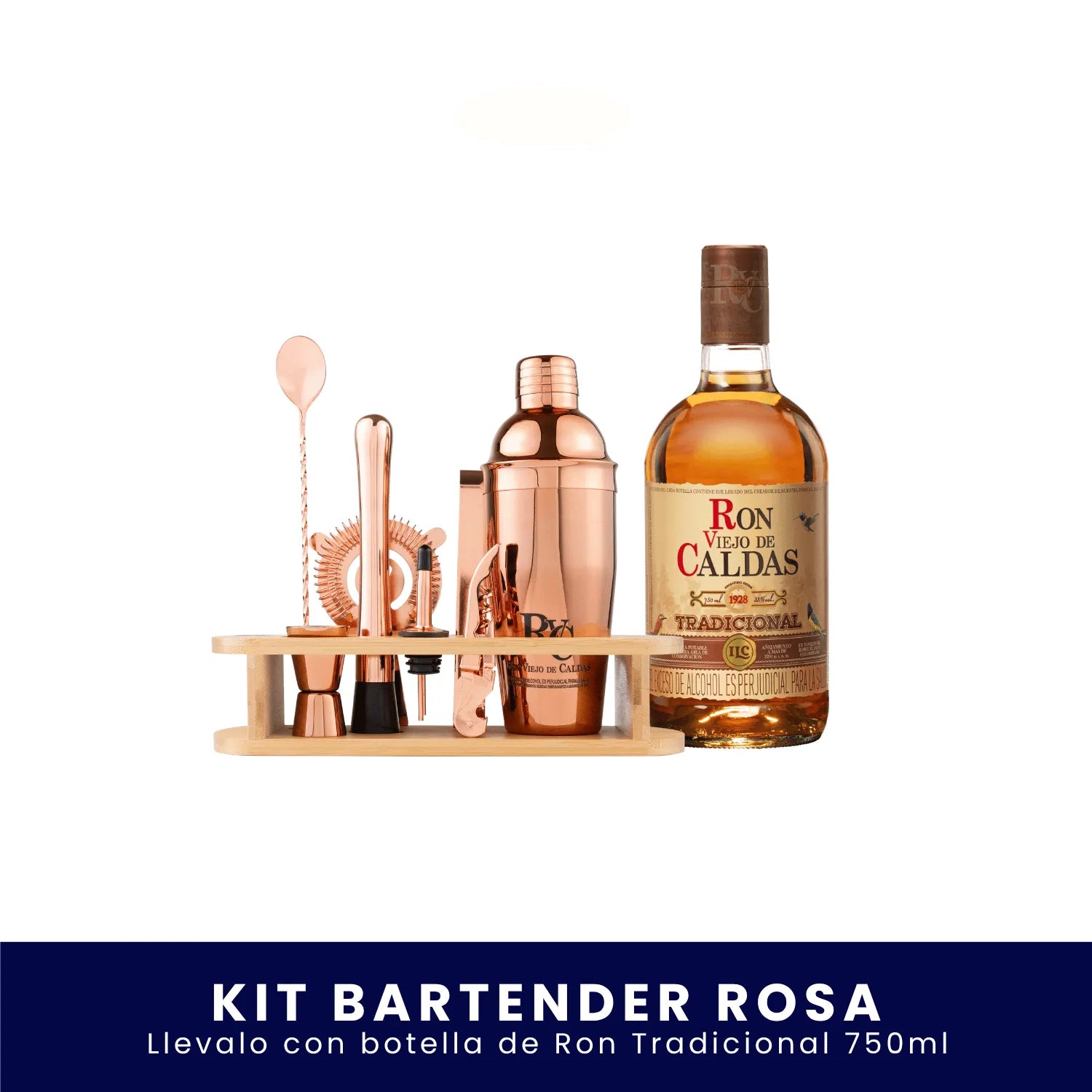 Mixología que luce y conquista. Con el Kit Bartender Palo de Rosa eliges la botella de Ron Viejo de Caldas (750 ml) que prefieras y preparas cocteles con un set profesional de acabado rose‑gold que roba miradas.