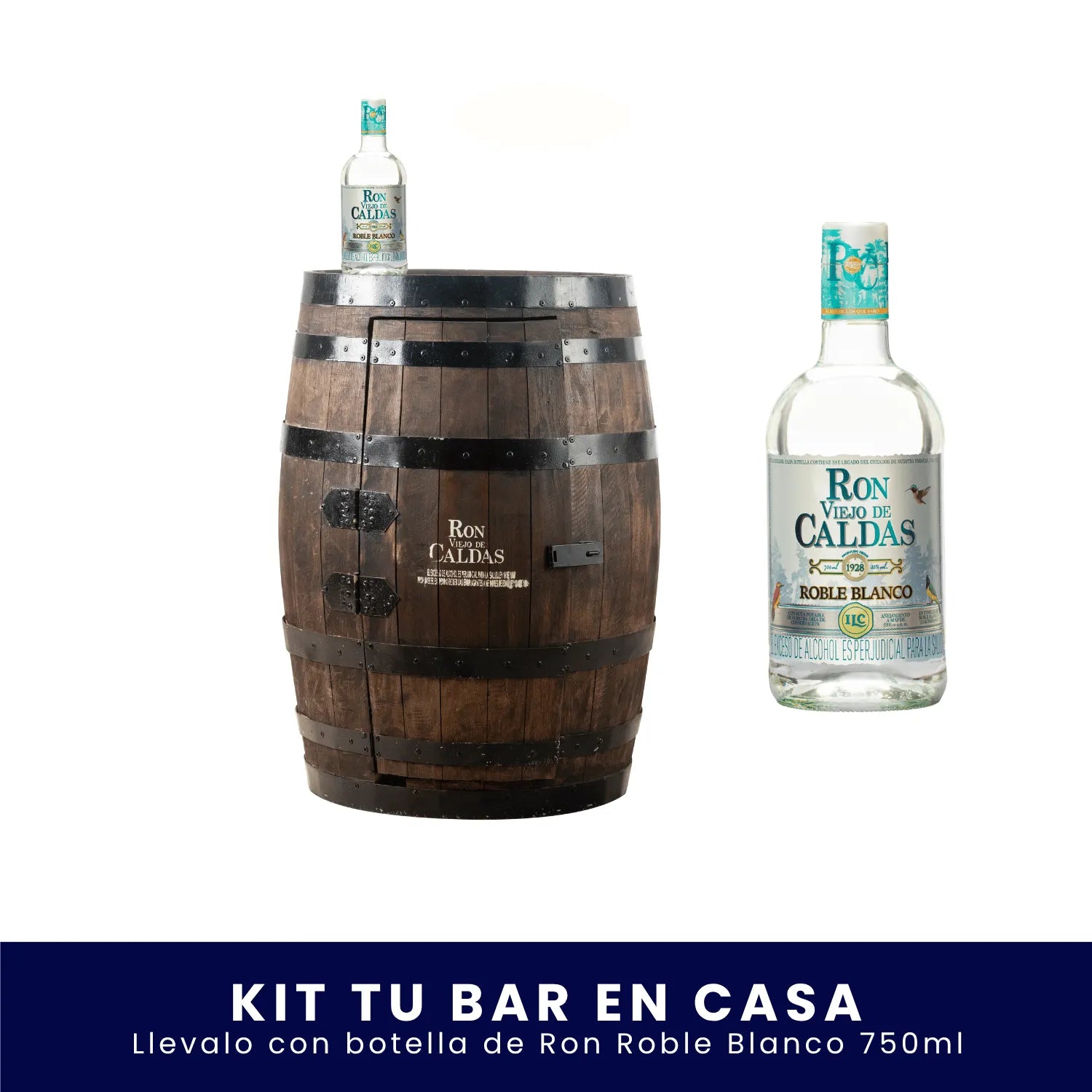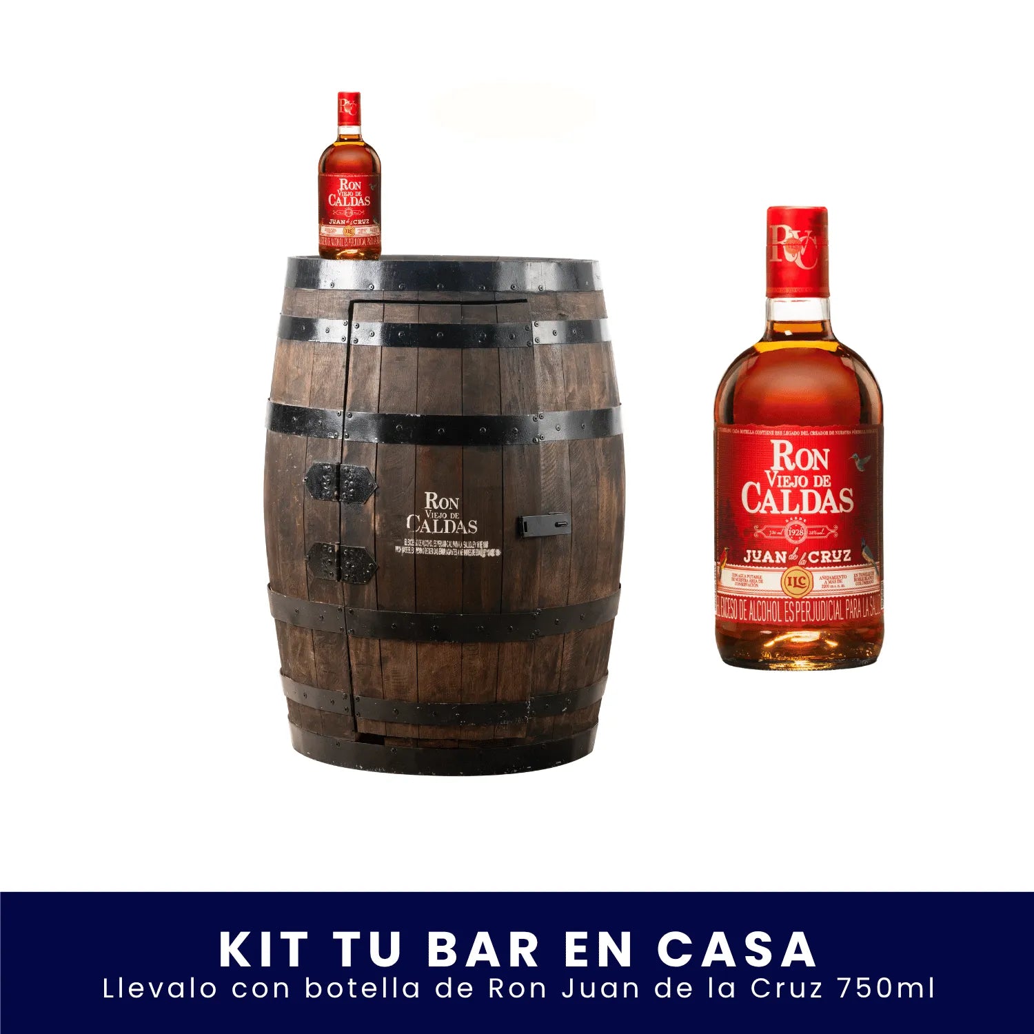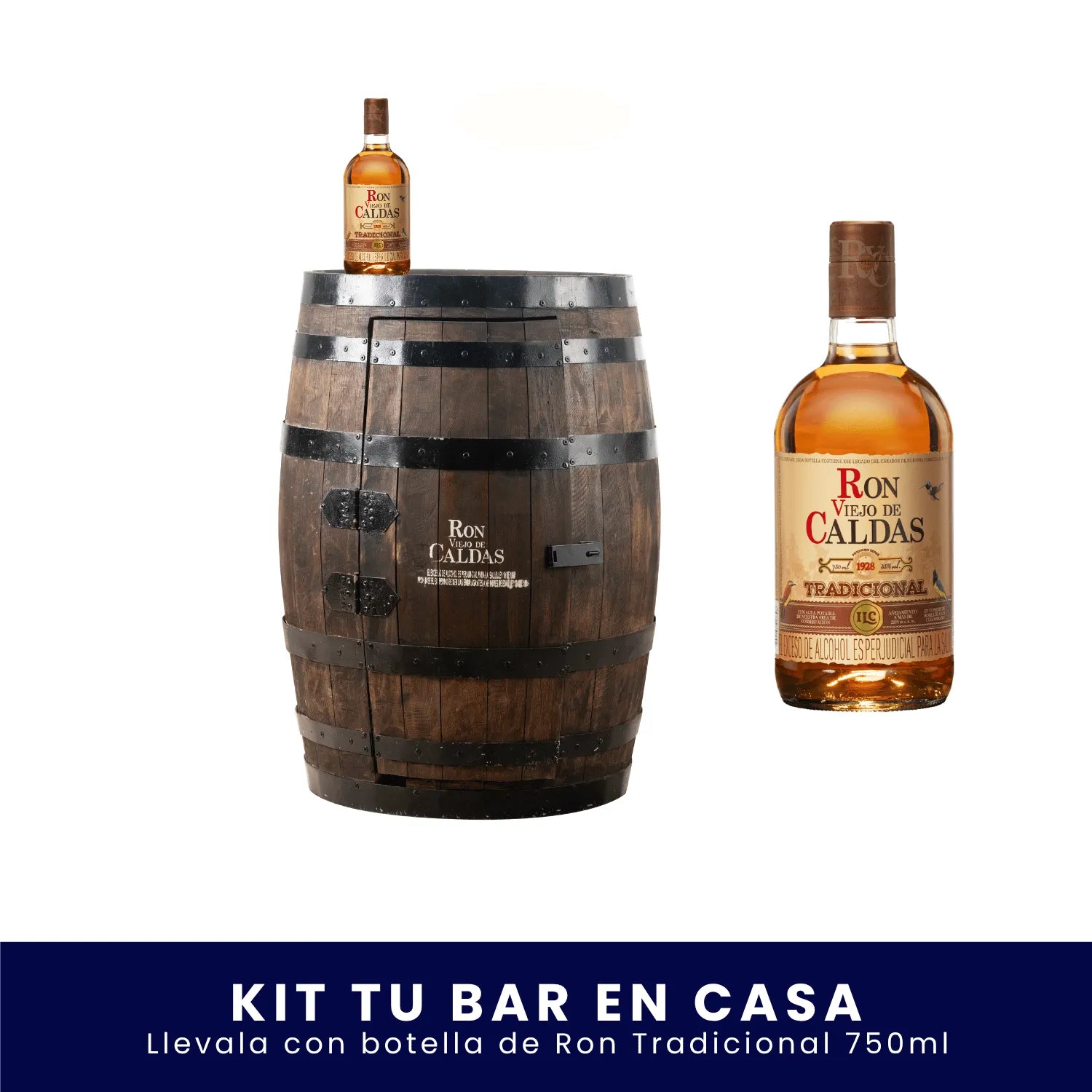 El kit se entrega con un barril bar + 1 botella de Ron Viejo de Caldas 750 ml. La cristalería y botellas adicionales no están incluidas.