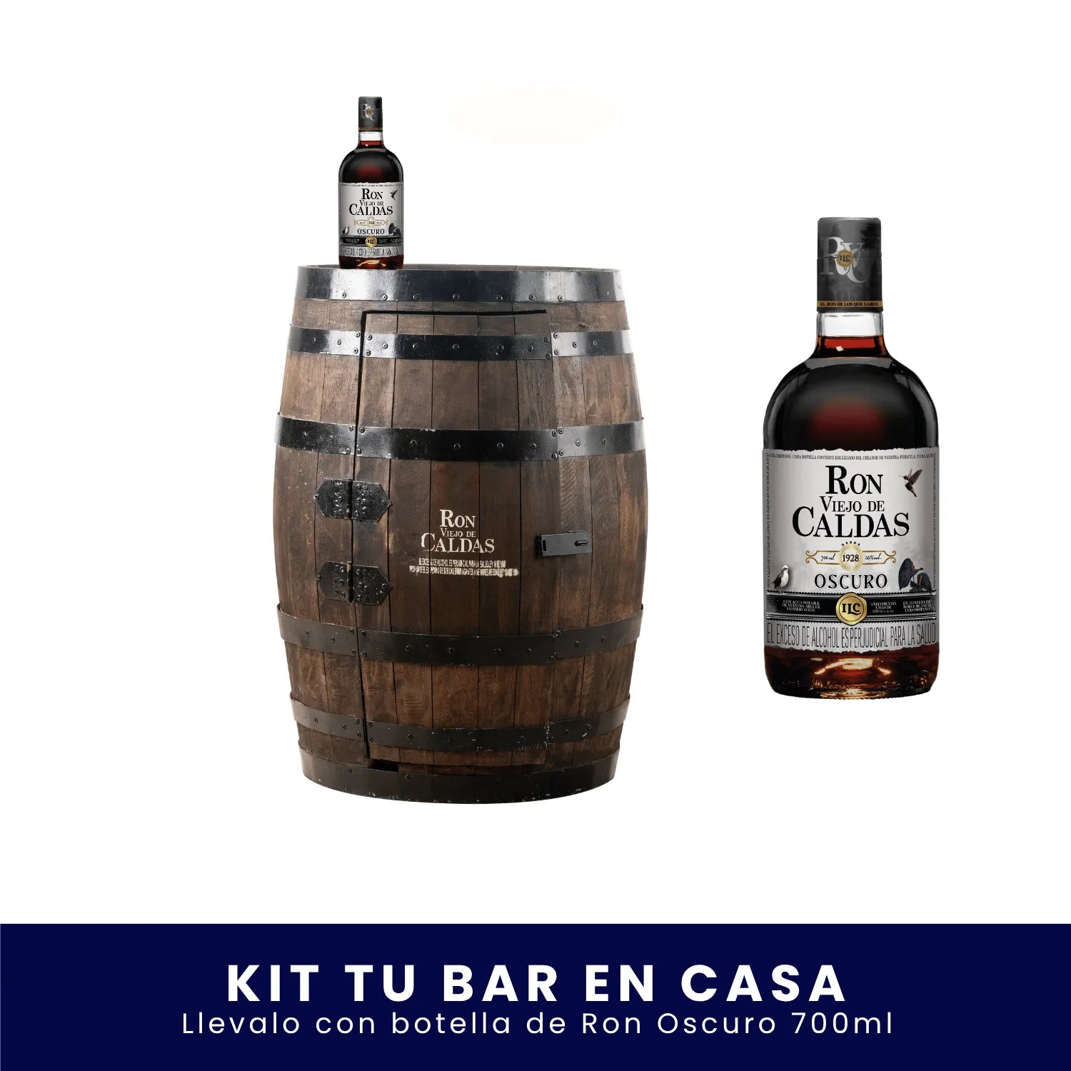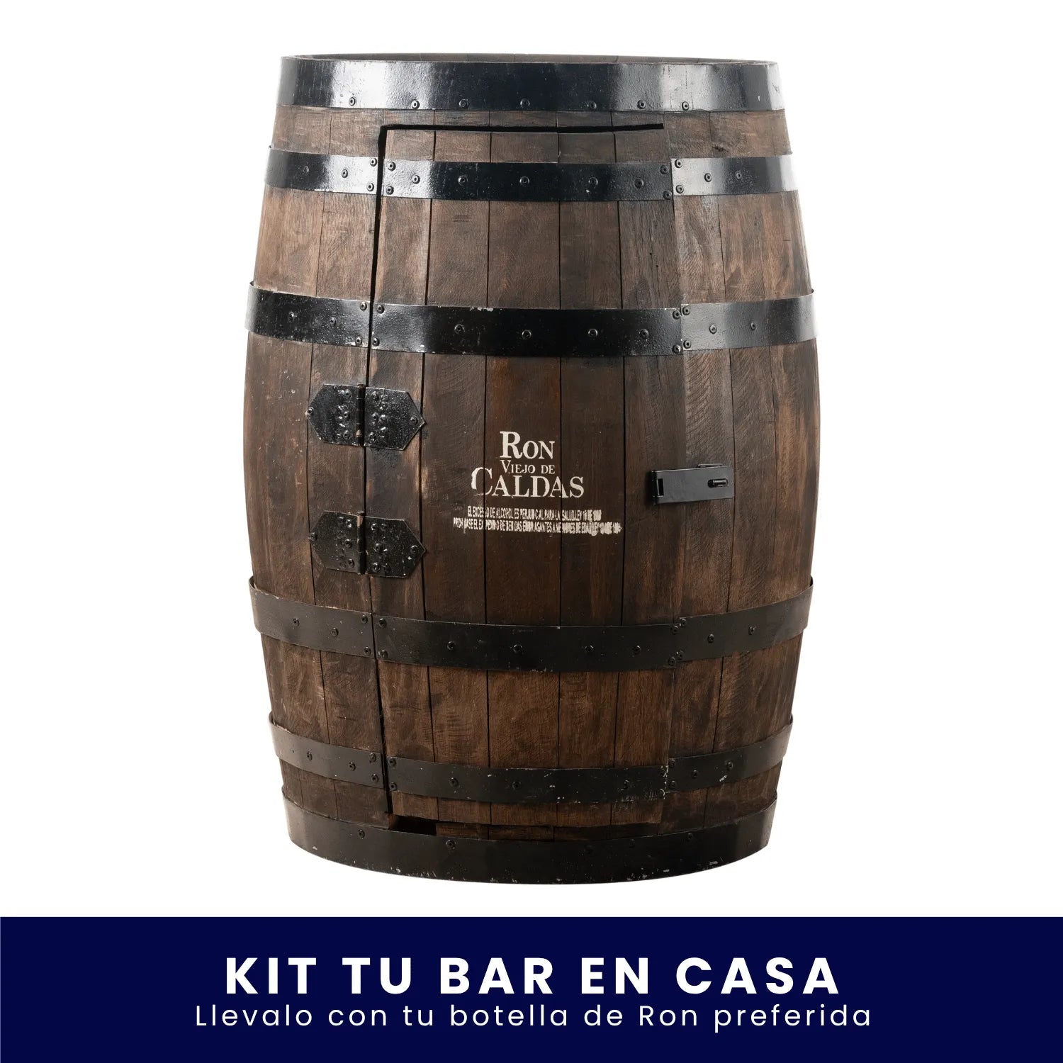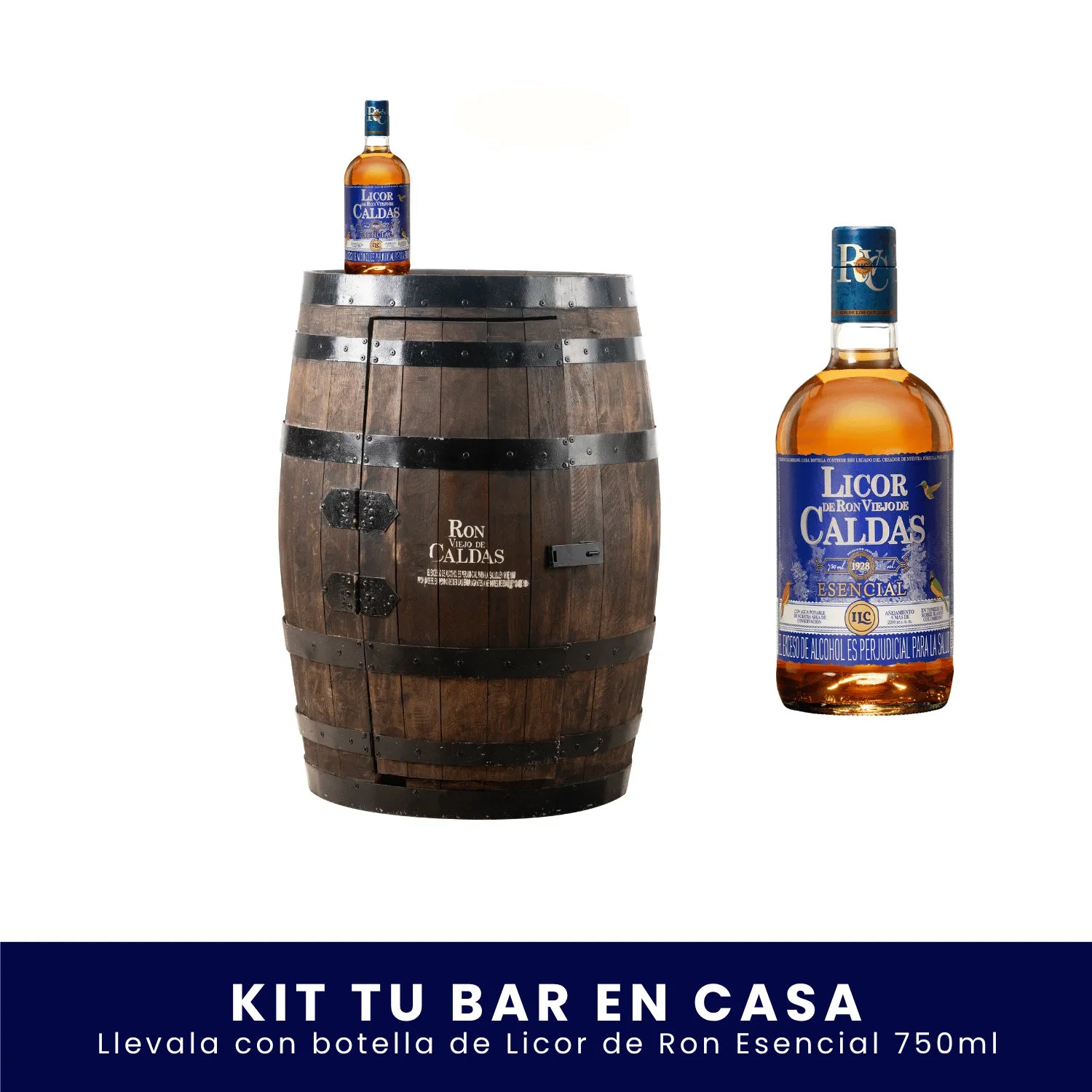 El kit se entrega con un barril bar + 1 botella de Ron Viejo de Caldas 750 ml. La cristalería y botellas adicionales no están incluidas.